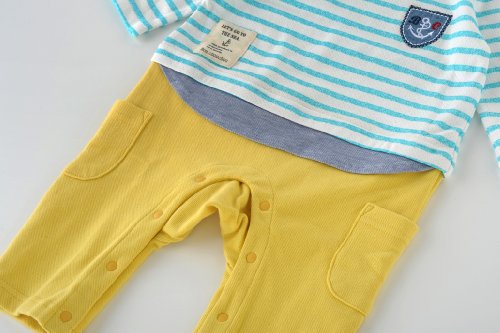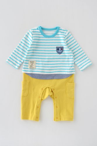 ユニセックスカラーがカワイイ!まるで上下をコーディネートしているように見えるオシャレな重ね着風カバーオールです。王道ボーダーのトップスにポケット付きのボトムスがカッコいい普段着にぴったりの1着です。春らしいカラーでおしゃれベビーを気取っちゃおう!■素材■上衣部分:接結天竺 綿100% ズボン部分:ストレッチツイル 綿95%ポリウレタン5% デニムニット生地:綿98%ポリウレタン2%