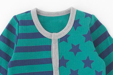 【前開きタイプ】 でお着替えラクラク、新米ママも安心!ボーダーと星柄を組み合わせたPOPでオシャレな長袖前開きロンパース♪ボトムスやレッグウォーマーを合わせてお出かけコーデを楽しんじゃおう!■素材:エアニット 綿100%