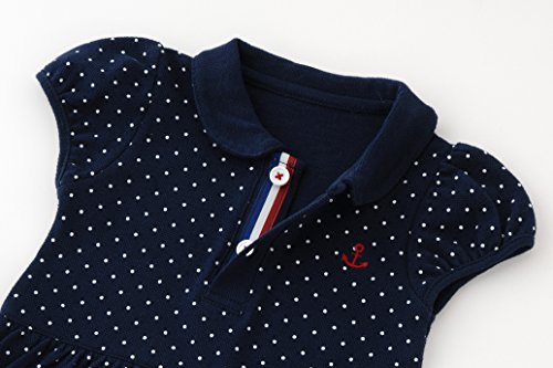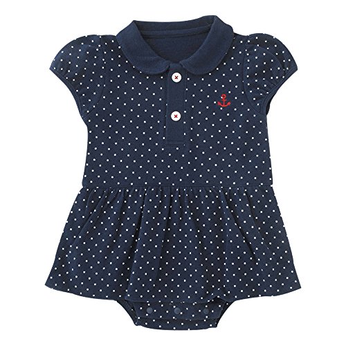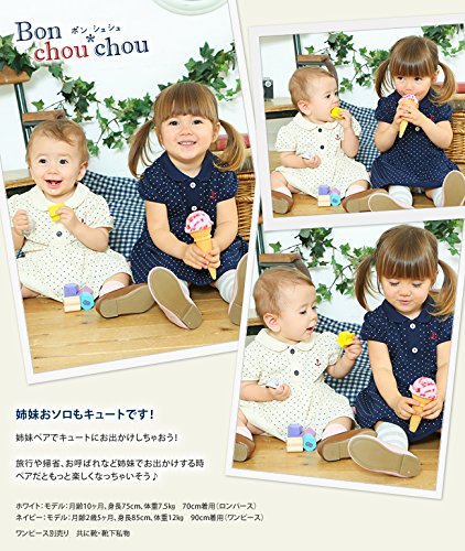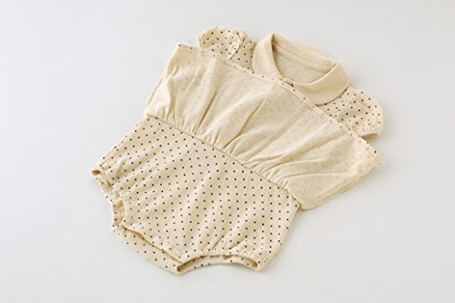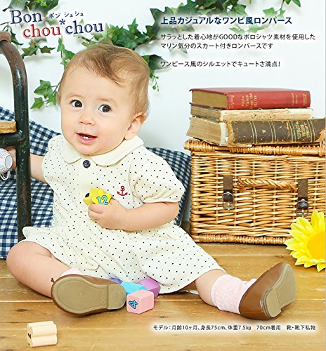 マリン気分満点のポロシャツ風スカート付きロンパースです!夏の旅行や帰省、お出かけにぴったりのおしゃれなドットロンパース。お出かけ先で可愛く目立つこと間違いなし!サラッと着こなせる凹凸のある鹿の子天竺がとっても爽やかです。■素材:鹿の子天竺 綿100%