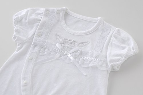 夏生まれにぴったりの半袖ショート丈新生児ツーウェイオールです 真っ白な生地に刺繍やレースをあしらった退院着やお宮参り、お披露目にぴったりの1着。ねんねの時期はドレスとして活発に足を動かし始めたらスナップを留め変えカバーオールタイプとして着せましょう。退院着やお披露目、お出かけにぴったりで出産お祝いの贈り物にもおススメです。■素材:ブライトドット天竺 綿95%ポリエステル5%