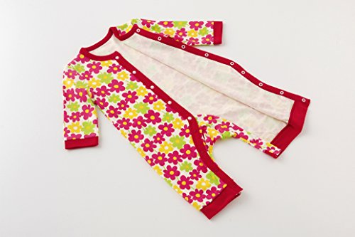 レトロなお花柄がキュートなお着替え簡単な前開きタイプの長袖カバーオールです。程よい厚みの年間素材スムースを使用したお部屋着やパジャマにぴったりの1着 ■素材:スムース 綿100%