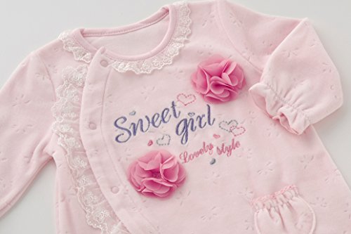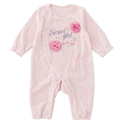 ベビーの愛らしさが引き立つパステルカラーが可愛い長袖カバーオールです。上品な光沢の冬素材のベロアを使用したお出かけにもぴったりの1着!お花のコサージュを付けて可愛さアップ 出産お祝いのギフトにもおススメです。■素材■本体:ベロ 〔?5%ポリエステル25%レース生地:ナイロン100%刺繍糸:表 レーヨン100%、裏 綿100%シフォン:ポリエステル100%