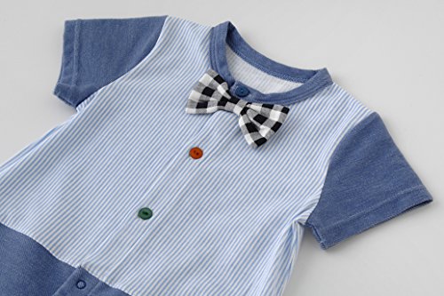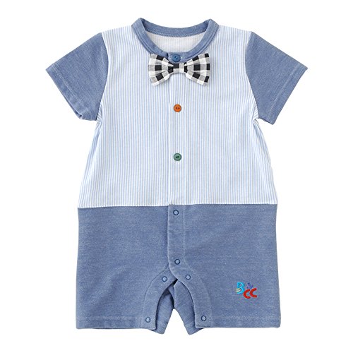 プチフォーマルなスタイルが可愛らしい蝶ネクタイ風リボン付き半袖前開きカバーオール。お誕生日会や結婚式、お食い初めなどイベントやお呼ばれにもぴったりです。■素材:天竺/デニムニット 綿100%