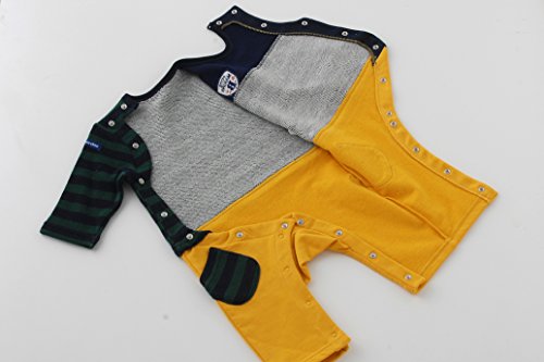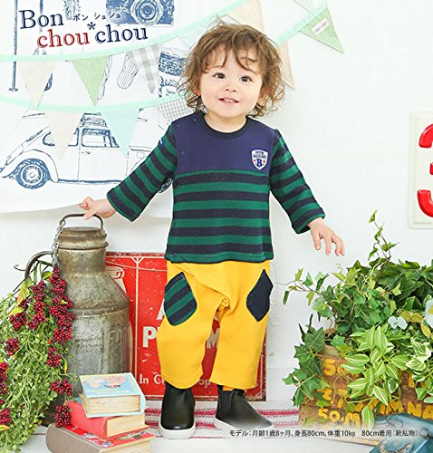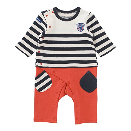 上下を着ているように見えるセットアップ風の長袖前開きカバーオールです。まるでコーディネートしているように見えるデザインでお出かけにもぴったり。■素材■ボーダー生地(上身頃・ポケット): 綿100% ヨーク・下身頃:綿95%、ポリウレタン5%デニムニット生地(ポケット):綿95%、ポリウレタン5%