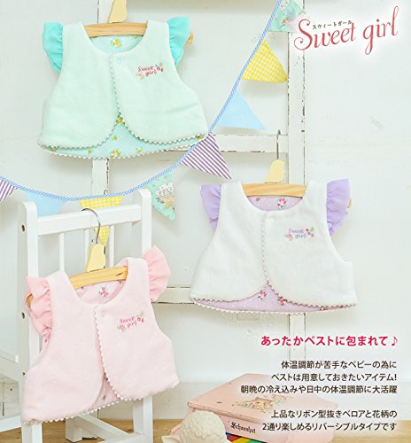 - 体温調節に大活躍のベストはマストバイ!大人と違って赤ちゃんは自分自身で体温調節が上手に出来ません。朝晩の冷え込みや、日中の体温管理にベストは欠かせないアイテムリボンに型抜きされた上品なベロアと花柄のリバーシブルタイプシフォンのフリル袖が可愛いアクセントになってます可愛いピンク、新鮮ミントグリーン、おしゃれパープルの3色展開です