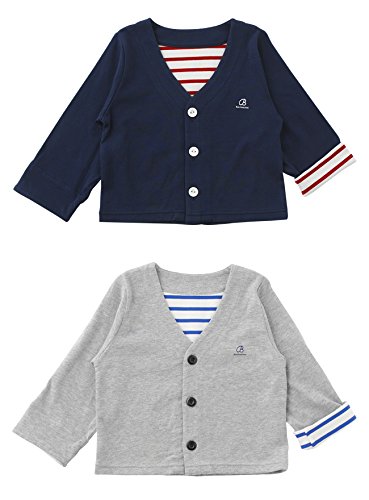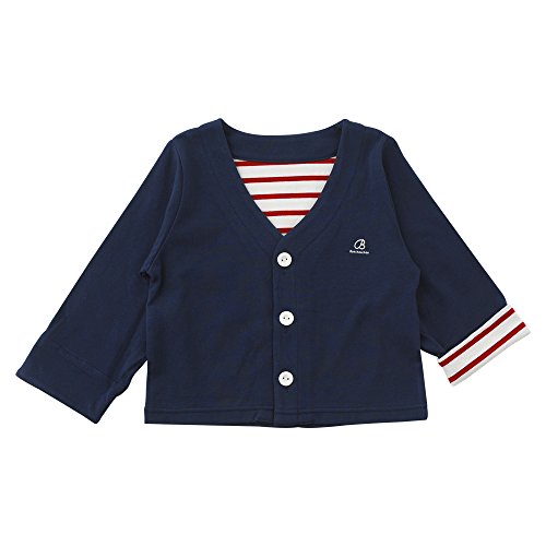 - 春 夏 の お 出 か け に 便 利 な カ ー デ ィ ガ ン 赤ちゃんは大人のように自分自身で上手に体温調節が出来ません。 朝晩の急な冷え込みや、冷房のきいたお部屋で過ごす時に、 大活躍してくれるカーディガンはマストアイテム! 春夏にぴったりの爽やかな素材を使用しました。 袖の裾を表に折り返すとボーダー生地がチラ見え。 シンプルだけど遊び心のあるカーディガンです。