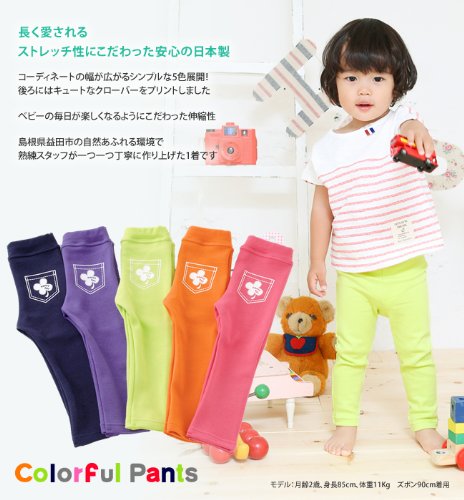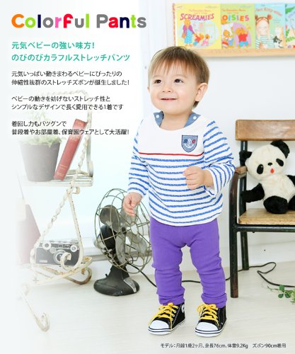 ストレッチ性抜群のベビーズボンの登場!カラバリ豊富でいろんなコーデが楽しめます☆似合う色がきっと見つかる!保育園や普段着にぴったりのパンツです。後ろ部分には見せかけポケットをプリント 座ってもごわつかずお尻すっきり!ウエストはゴムだから着脱簡単!程よい厚みの素材で通年着用OK!安心安全の日本製です。■素材:綿98%ポリウレタン2%