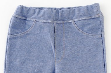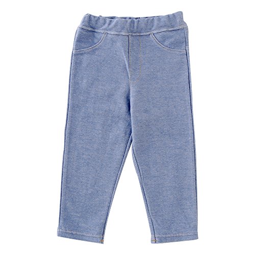 トップスとの相性もばっちりな普段着に大活躍のデニムニットのベビーズボン。ストレッチ性抜群で保育園ウェアとしてもGOOD!男の子でも女の子でもOKなデザインでお出かけ着に最適★ウエストはゴムだから着脱簡単!■素材:デニムニット 綿97%ポリウレタン3%
