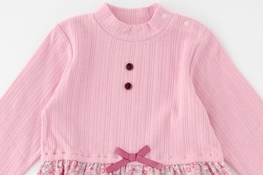 シンプルな質感のあるジャガード生地と小花柄が愛らしいコーデュロイを合わせた秋冬のお出かけにぴったりのワンピースです。 カーディガンやベストを組み合わせれば長く着ることが出来ます。おむつも替えやすいワンピースは女の子ベビーの強い味方です!■素材■上部(ジャガード接結天竺):綿100% 花柄(コーデュロイ):綿100% リボン:ポリエステル100%