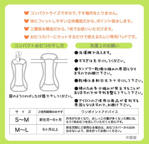 たたむ手間いらずの成形タイプの布おむつ。オムツカバーにセットするだけで使えるオムツ専用パッドです。\コンパクトおむつのポイント/●コンパクトサイズでお洗濯の際、干す場所をとりません。●体にフィットした立体構造だから、 ポイント吸水します。●三層構造だから、1枚でお使いいただけます。■素材・・・ニットキルト綿100%■中国製
