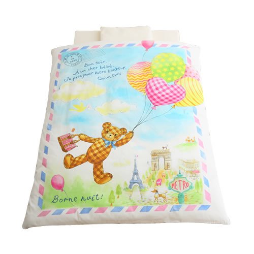 備考:☆ポストカードのような絵柄がプリントされたキュートなベビー布団セット!まるで羽毛ふとんのような保温性とフィット感がある掛ふとんです。