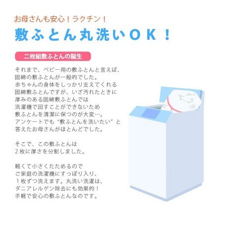 また、敷きふとんは一般的な固綿だと厚みがあり洗濯機で回せませんが、この敷ふとんは1枚ずつ洗え、ダニアレルゲンの除去にも効果的で、より清潔にご使用いただけます。