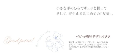 まだ握力が弱いベビーにピッタリ。ぬいぐるみの手足はやわらかく、肌触りも抜群。