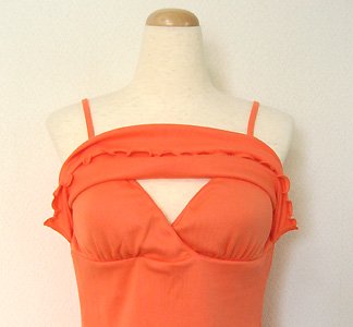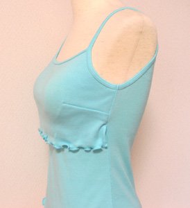 ブラなしで1枚で着られるカップ付きのアウター・キャミソール♪夏らしいオレンジとサックスの2色☆かぶせ布と裾の処理はひらひら波打つメロウ始末にして、見た目もおしゃれに・・・生地は、伸縮性のあるフライス綿。苦しい締めつけ感がまったくなく身体に気持ちよくフィットします!
