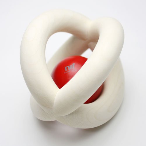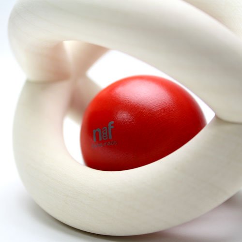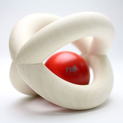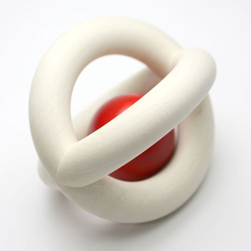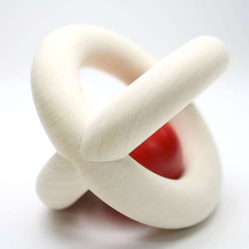 白木のリング2本がクロスした、ボール型の掴みやすいおしゃぶり(ラトル)です。転がしたり傾けたりすると、リングのカーブに沿って赤い木の玉がゆらゆら揺れます。振るとカチャカチャと心地よい木のぶつかりあう音が聞こえてきます。