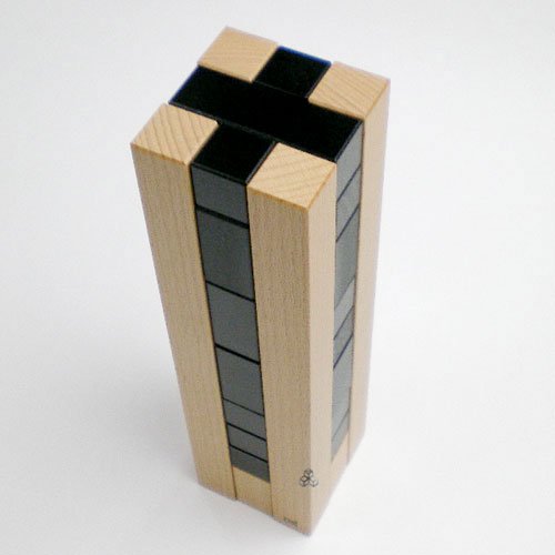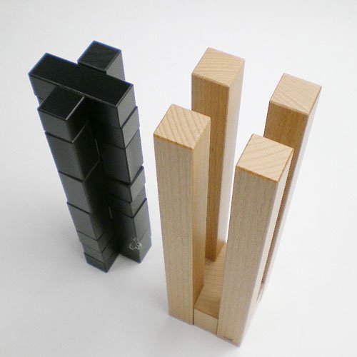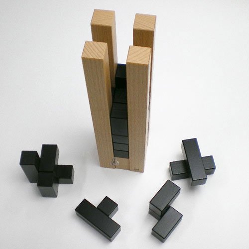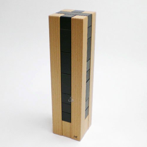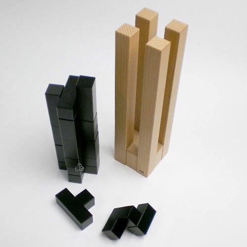 カンパニーレは10種類の形状が違うキューブを十字型のケースにはめ込む立体パズルで、解答が30種類はあると言われています。十字に組まれたケースの中にパーツを落とす感触、音も心地良い。こちらは難易度の高い黒タイプで、パーツが色分けされ難しさが軽減された色タイプもある。