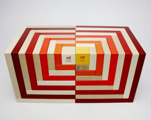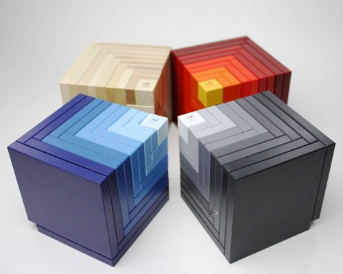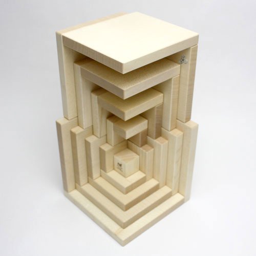 1辺10cmの立方体を分割した構造で、9個のパーツから構成されています。中央の立方体が2cmで、パーツがシェル(貝)のように8個、重なり合っています。