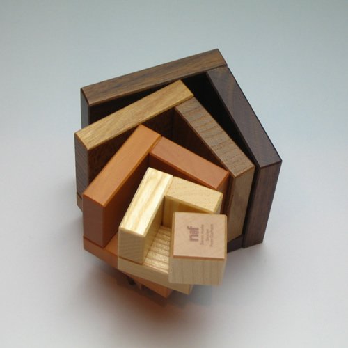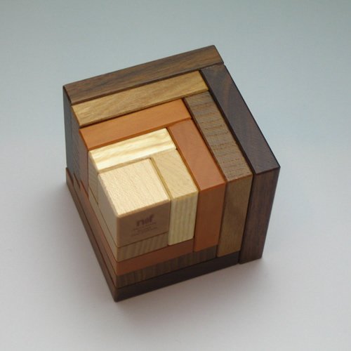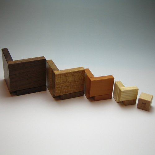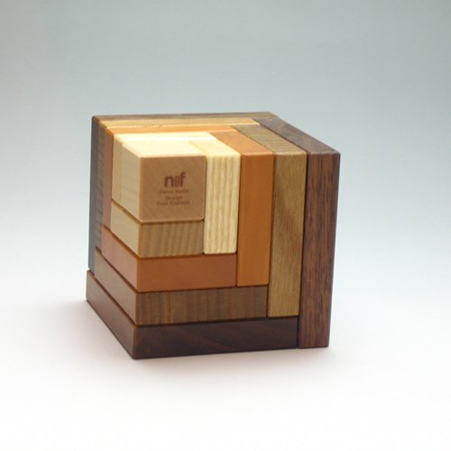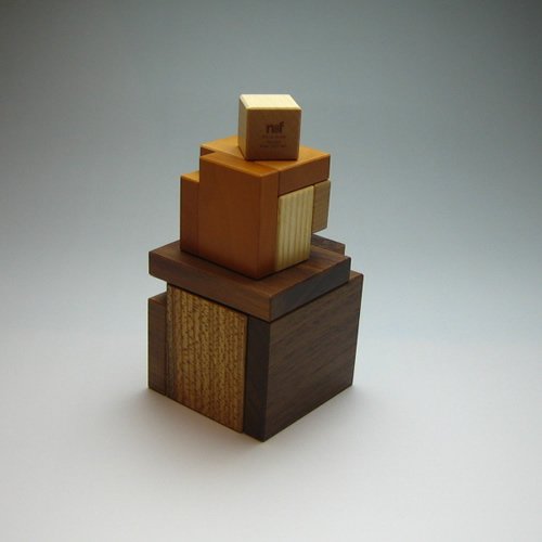 立方体をスライスしたようなパーツは、1つ1つ四角錐の頂点部分に工夫があり、アクロバットなシルエットでも安定よく積むことができます。中央の立方体が2cmで、その回りを1cmの厚さのパーツがシェル(貝)のように4個、重なり合っており、4種類の木目のグラデーションが楽しめます。材質は小さいパーツからカエデ/トネリコ/ナシ/ニレ/クルミ。