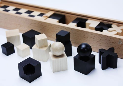 ドイツの造型学校「バウハウス」で製作されたチェスの復刻版。ワイマール校の壁画レリーフの制作をしていたハルトヴィッヒが、1921年~25年にかけて彫刻工房のマイスターとして勤務していたバウハウス創設期の作品。時代を超えたBauhauseスタイルの典型とも言えるシンプルで美しいチェス駒です。このバウハウスのチェスは、誰でも駒の形を見ただけで、その動きが想像できるため、気軽に楽しめるよう設計されています。(例:■は前後左右に、×は斜めに進む。)