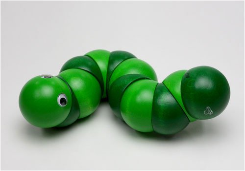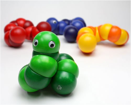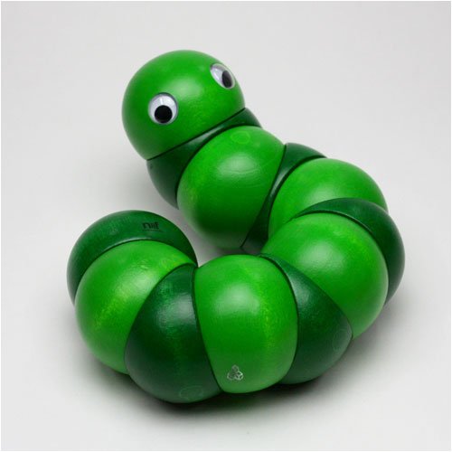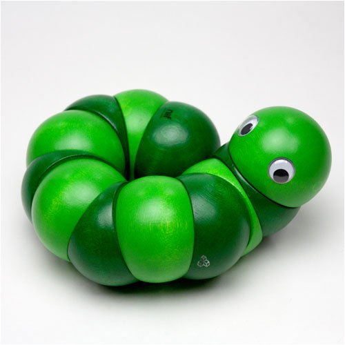 握ったり、ねじったりして遊ぶ木のおもちゃで、世界的に有名な玩具メーカーのスイス・ネフ社の1983年の作品。直径4cmの12個のパーツ(頭と尻尾のそれぞれ2個のパーツは固定なので、可動部分は10箇所)が丈夫なゴムで固定されています。両手を使ってクネクネと、好きな形にして楽しめます。