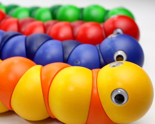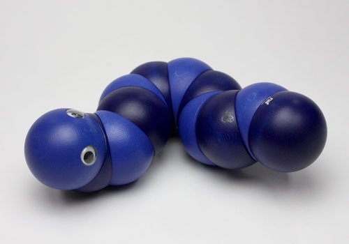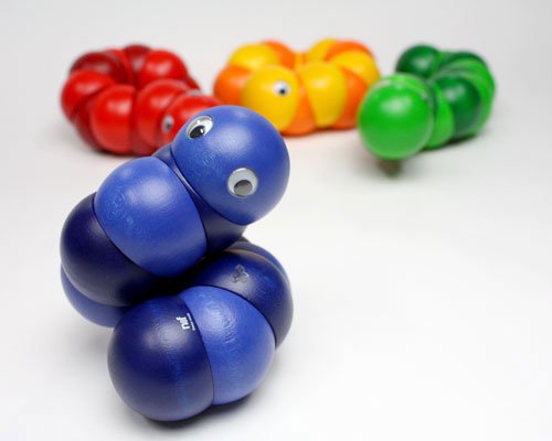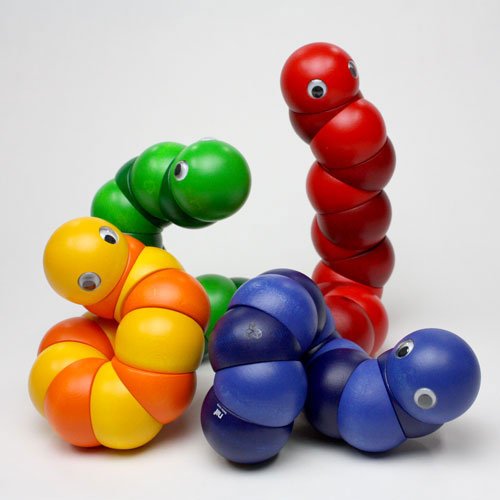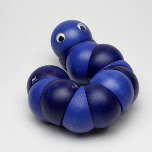 握ったり、ねじったりして遊ぶ木のおもちゃで、世界的に有名な玩具メーカーのスイス・ネフ社の1983年の作品。直径4cmの12個のパーツ(頭と尻尾のそれぞれ2個のパーツは固定なので、可動部分は10箇所)が丈夫なゴムで固定されています。両手を使ってクネクネと、好きな形にして楽しめます。