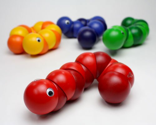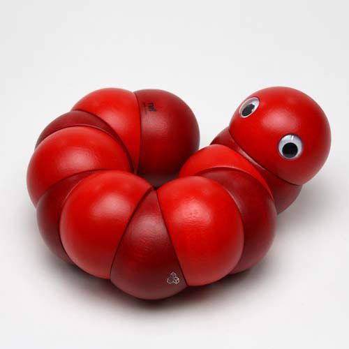 握ったり、ねじったりして遊ぶ木のおもちゃで、世界的に有名な玩具メーカーのスイス・ネフ社の1983年の作品。直径4cmの12個のパーツ(頭と尻尾のそれぞれ2個のパーツは固定なので、可動部分は10箇所)が丈夫なゴムで固定されています。両手を使ってクネクネと、好きな形にして楽しめます。