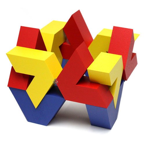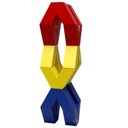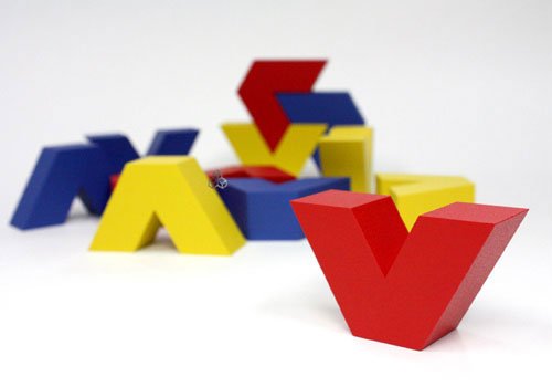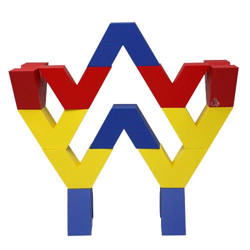 相沢康夫氏のネフ2作目。赤、青、黄3色の色鮮やかなV字形積み木が各4個づつ全12ピースで構成されています。60度を基本に作られている点がユニークでV字のくぼみにとがった先がぴったりとはまります