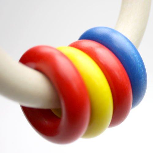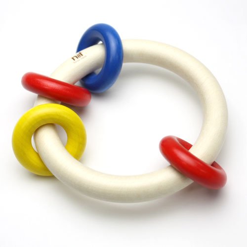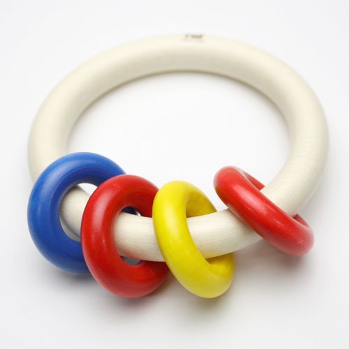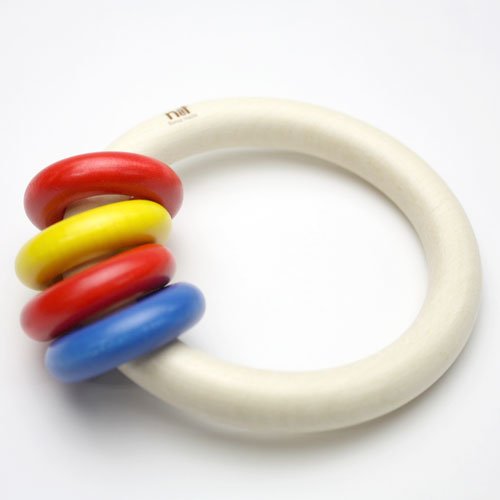 ネフ社のおしゃぶりの中でもっとも軽く握りやすいので、最初に与えるおしゃぶり(ガラガラ)として最適です。1つの輪に、赤・黄・青に彩色された小さな輪が4個ついていて、クルクルカラカラと軽快な音をたてて回ります。軽さとシンプルな作りが低月齢のベビーにも扱いやすく歯茎がムズムズするときはガジガジ噛んで歯固めになります。