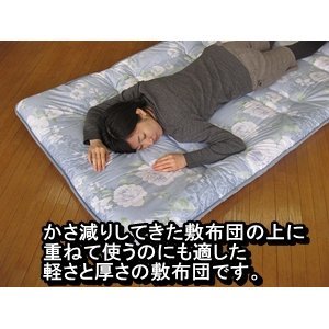 【出荷目安】:1 - 8営業日 ※土日・祝除く 【同梱区分】:TS 1424 【梱包サイズ】:大型商品 ●真ん中で折れるので簡単に干せます ●軽いので上げ下ろし楽々 ●安心の日本製です コンパクトに収納できる4つ折り可能な敷布団。軽くて持ち運びも楽々!真ん中部分で折れるので竿干しも簡単!通常の敷布団として、またかさ減りしてきた敷布団の上に重ねて使うのにも適した軽さと厚さの敷布団です。 【商品名】 コンパクト収納 4つに折れる軽量敷布団 シングルブルー 【サイズ】 約100×210cm 【重量】 約3100g 【材質】 側地:綿100% 中綿:ポリエステル100%(約1.5kg) 中芯:ポリエステル硬綿 【生産国】 日本