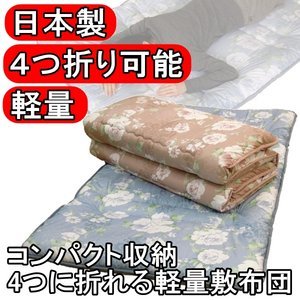 - 【出荷目安】:1 - 8営業日 ※土日・祝除く 【同梱区分】:TS 1424 【梱包サイズ】:大型商品 ●真ん中で折れるので簡単に干せます ●軽いので上げ下ろし楽々 ●安心の日本製です コンパクトに収納できる4つ折り可能な敷布団。軽くて持ち運びも楽々!真ん中部分で折れるので竿干しも簡単!通常の敷布団として、またかさ減りしてきた敷布団の上に重ねて使うのにも適した軽さと厚さの敷布団です。 【商品名】 コンパクト収納 4つに折れる軽量敷布団 シングルブルー 【サイズ】 約100×210cm 【重量】 約3100g 【材質】 側地:綿100% 中綿:ポリエステル100%(約1.5kg) 中芯:ポリエステル硬綿 【生産国】 日本