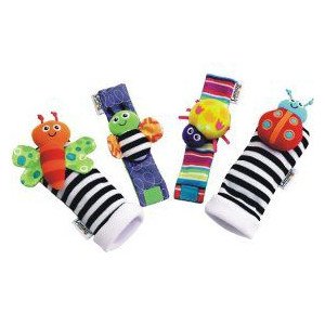 ラマーズのおもちゃ:Lamaze Garden Bug Wrist Rattle/Foot Finder Set 対象年齢: 3ヶ月以上。 素材:ポリエステル製 メーカー: Lamaze(アメリカ) ラマーズの提供する知育玩具。ソフトな手首用ガラガラと足につけるおもちゃの4個セット。庭の虫たちをモチーフにした、鮮やかな色合いの模様で赤ちゃんの知覚を刺激します。視覚と手の運動能力の発達を促します。知育玩具、布のおもちゃ