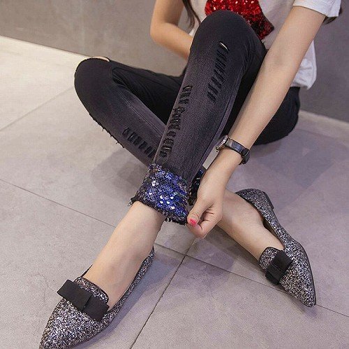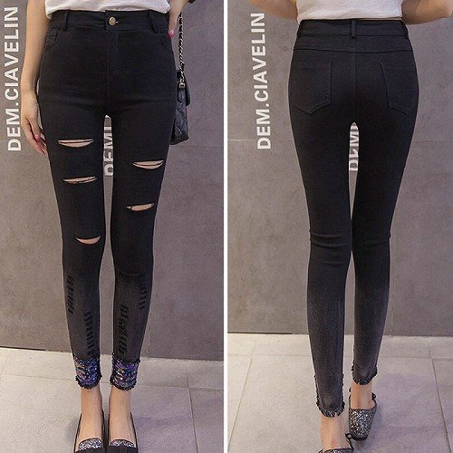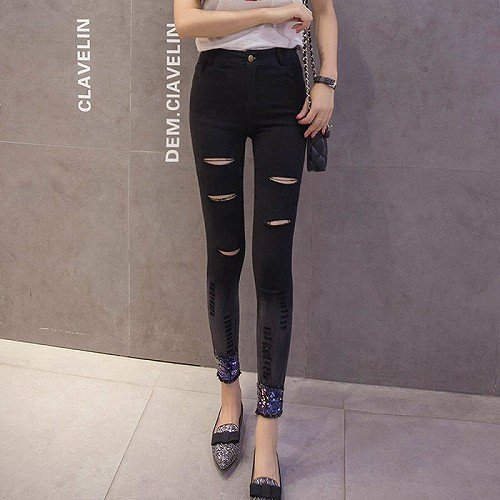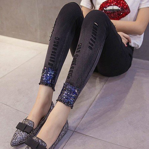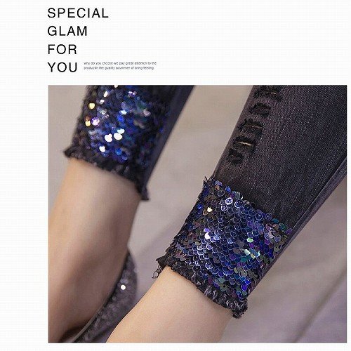 新品 ボトムス スキニー パンツ ストレッチ レディース ダメージ スパンコール☆M★単色