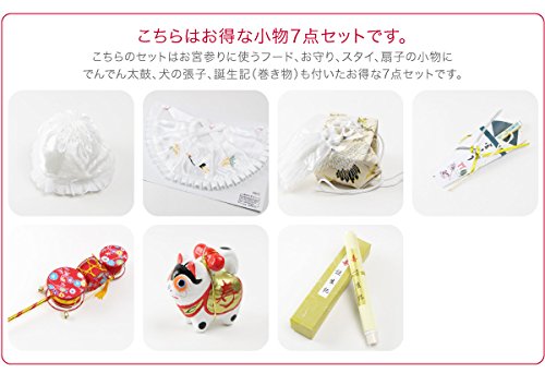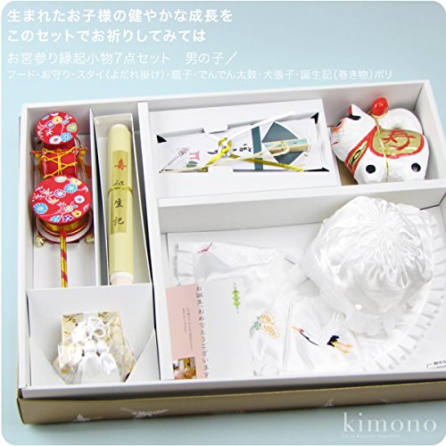 商品説明:注意:画面上と実物では多少色具合が異なって見える場合もございます。ご了承ください。 備考:お宮参りは元来「産土(うぶすな)詣り」と呼ばれ、お子様の誕生を産土の神様に感謝し、そのお子様の健やかな成長を祈願したことからきています。こちらのセットはお宮参りに使うフード、お守り、スタイ、扇子の小物にでんでん太鼓、犬の張子、誕生記(巻き物)も付いたお得な7点セットです。スタイには鶴と松竹に刺繍、フリルが付いています。無ホルマリン加工で、大事な赤ちゃんにも安心です。お守りは鶴のおめでたい刺繍が入っています。フードにはレースのフリルが付いてカワイイです。男の子の白お宮参りの栞も付いています。張子の名入れ部分の凹みは商品の品質差、製品誤差によるもので難ではございません。予めご了承ください。