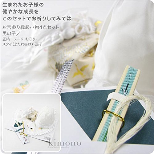 商品説明:注意:画面上と実物では多少色具合が異なって見える場合もございます。ご了承ください。 備考:お宮参りは元来「産土(うぶすな)詣り」と呼ばれ、お子様の誕生を産土の神様に感謝し、そのお子様の健やかな成長を祈願したことからきています。こちらのセットはお宮参りに使うフード、お守り、スタイ、扇子の小物4点のセットです。フードとスタイの表地が正絹になっています。スタイには鶴と松竹に刺繍、フリルが付いています。無ホルマリン加工で、大事な赤ちゃんにも安心です。お守りは鶴のおめでたい刺繍が入っています。フードにはレースのフリルが付いてカワイイです。