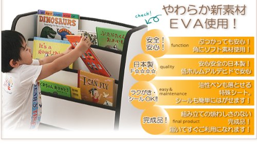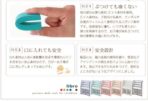 - ●楽しく、優しく。絵本のおうち。ソフト素材キッズファニチャーシリーズ 棚付絵本ラック【libro】リブロPOINT1 安全性全ての角にソフト素材EVA樹脂を使用。サンダルや、お風呂マットなどにも使われるEVA樹脂は柔らかく、強度があります。製品の角の部分にこのEVA樹脂を使用しているので、万が一お子様がぶつけてしまった時の、衝撃を軽減します。POINT2 日本製、F☆☆☆☆の安心品質シックハウスの原因となるホルムアルデヒドの放散基準評価で最高ランクのF☆☆☆☆(フォースター)を取得、製品設計段階から、使用する木材、接着剤などすべてにこだわり、国内の工場で生産しています。POINT3 落書きを空拭きで消せる特殊シートもしお子様に落書きされてしまっても大丈夫。油性ペンでも空拭きで消せるクリーンイーゴスを使用しているので簡単に汚れを落とせます。(※ソフト素材の部分は非対応)POINT4 届いてすぐに使える完成品でお届け箱から出すだけですぐに使える完成品。作りも非常にしっかりしているので、末永く・・・続きは「商品説明」をご覧ください。