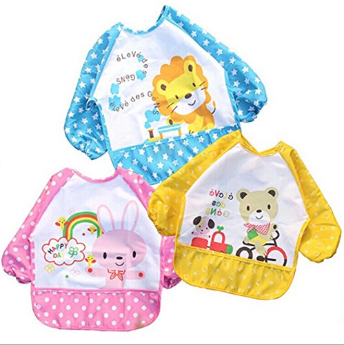 ベビー 長袖 エプロン 子供 幼児 スモック 食事用 動物柄 キャッチポケット付き 全3色 1歳 2歳 3歳 (三色セット)