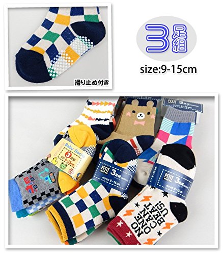 (タイプE/9-15cm)ベビー 子供 靴下 ソックス クルー丈 男の子 3足組 滑り止め付き 男児 キッズ