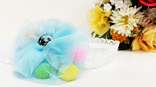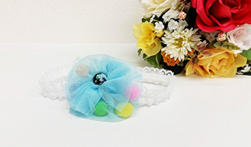 ベビー/赤ちゃん用ヘアアクセサリー/ヘアバンド/カチューシャ/ブルー/ オレンジ、ブルー、ピンク、イエロー、グリーン、パープルのポンポン入り/ゴムの部分は白いヒラヒラレース♪ 【対象年齢】:0~3歳 サイズ:フリー 伸縮性ゴム使用 直径約20cm、幅約2cm