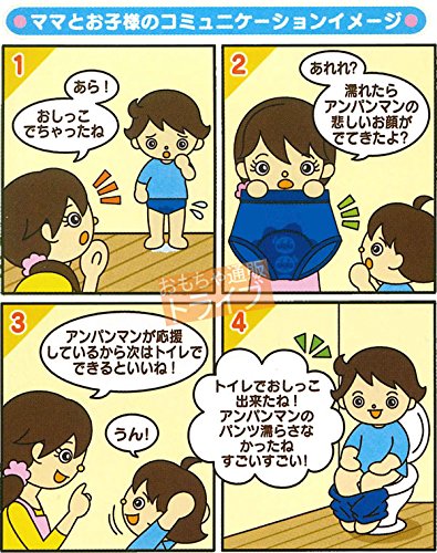 アンパンマンのおむつはずれ応援パンツです。股の部分に特殊プリント加工がされていて、その部分が濡れるとアンパンマンの悲しい顔が浮き出てきて「悲しい顔のアンパンマンを見たくない」という気持ちからお子様のやる気を引き出し、トイレに誘いやすくしてくれます。この商品はトイレトレーニングパンツとは違い、防水加工されていませんので、トイレトレーニング終了後は普通のパンツとしてご使用いただけます。【サイズ】