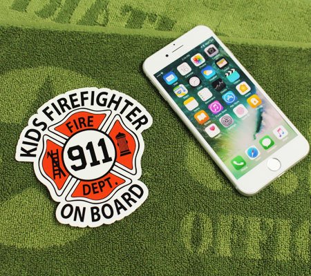 アメリカの消防車をイメージした「子供消防員乗ってます」のデザイン♪