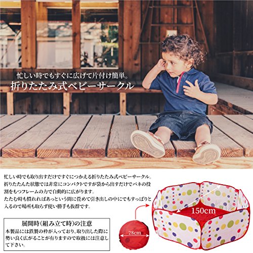 ベビーサークル 折りたたみ 150cm 48cm 水玉柄 簡単収納 ボールプール ベビーゲート ベビールーム 自立 赤ちゃん キッズ 新生児 幼児 育児 【商品説明】 使用しない時は小さく折り畳めて収納場所に困らないベビーサークル! 広げる時も一瞬で組み立て可能で必要な時にすぐ広げられます。 コンパクトでとても軽量ですので、持ち運びにもとても便利です! 床面と壁面が接着されていますので、ボールプールとしても楽しめます! 【商品内容】 ■ 折りたたみ式ベビーサークル×1 【商品詳細】 展開時 ■高さ 48cm ■幅 150cm ■材質 ナイロン/スティール 折りたたみ時 ■幅 77cm ■高さ 48cm ■厚さ 3cm 収納時 ■直径 28cm
