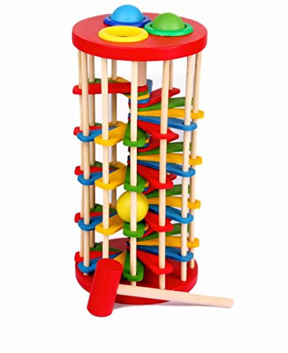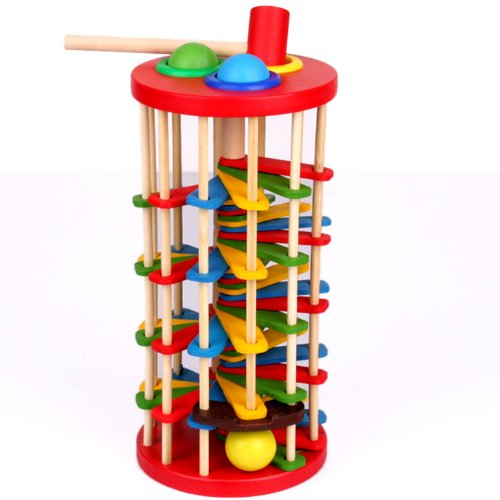- 上のボールととんと叩くとコロコロとタワーを降りてくるタワー型のスロープトイ木製おもちゃです。 とんかちでボールを叩くと、らせん階段をコロコロ転がります。