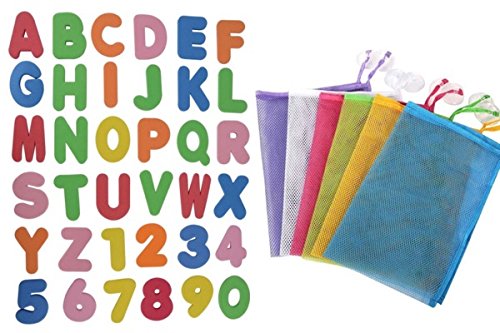 お風呂で浴槽に浮かせたり、壁に貼って遊べます。■遊びながら楽しく数字やアルファベットを覚えることが出来ます。■遊ぶときはネットから出し、使い終わったらネットへ戻すというように片付けの練習にもなります■ネットは網目状になっている為、水切りお出来ます。他のおもちゃも一緒に入る大きさです
