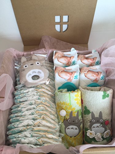 おむつは、パンパースのSサイズ20枚(1枚1枚袋に入れています) おしりふきは、パンパース56枚X4個(皮膚科医監修の下テスト済み 厚手シートでうんちもやさしく1枚でしっかり拭けます ノンアルコールで無香料 弱酸性シート 肌にやさしいローション配合 タオルは、ウォッシュタオル2枚 おもちゃは、トトロかネコバスのガラガラ1個 箱の大きさ W330xH165xD330mm
