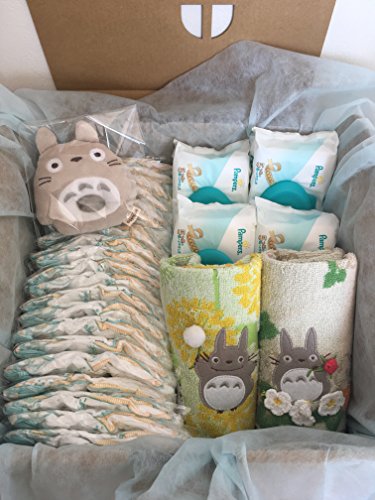 おむつは、パンパースのSサイズ20枚(1枚1枚袋に入れています) おしりふきは、パンパース56枚X4個(皮膚科医監修の下テスト済み 厚手シートでうんちもやさしく1枚でしっかり拭けます ノンアルコールで無香料 弱酸性シート 肌にやさしいローション配合 タオルは、ウォッシュタオル2枚 おもちゃは、トトロかネコバスのガラガラ1個 箱の大きさ W330xH165xD330mm