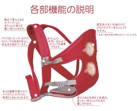 ・通気性が良いメッシュ生地なので、汗をかきやすい赤ちゃんでも蒸れにくい。 ・0か月~16か月の赤ちゃんに。 ・幅広で厚くクッション性のあるストラップにより、赤ちゃんの重みを優しく受け止めます。 ・クロス式のストラップが脱落を防止し、安全性を高めています。 ・赤ちゃんの体系やママのウエストサイズに合わせて、ストラップを調整できます。 ・赤ちゃんのお尻があたる部分は、生地を2枚重ねにしてあるので、しっかりと守ります。 ※前かがみや屈んだりなどの無理な体勢では、隙間が拡がり、赤ちゃんが落ちる事も有り得ますので、必要な場合はしっかりと抱きかかえてサポートしてください。
