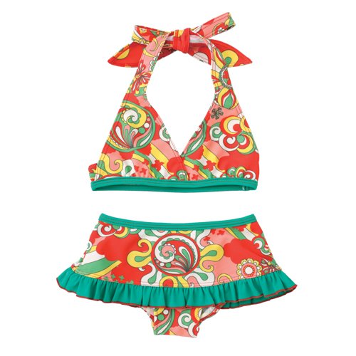 ピンクのサイケ柄にグリーンのフリルがおしゃれなビキニです。おしりにもリボンつきで後姿もキュート!
