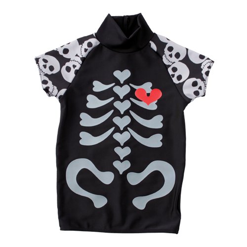 モノトーンの大人っぽいドクロ柄に胸の赤いハートプリントがクールなラッシュガード。紫外線対策に、1枚は用意しておきたいですね。