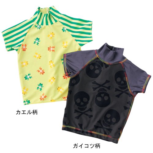 鮮やかカラーのカエル柄がかわいいラッシュガード。水遊びや日ざしが強いリゾートで大活躍のアイテムです。