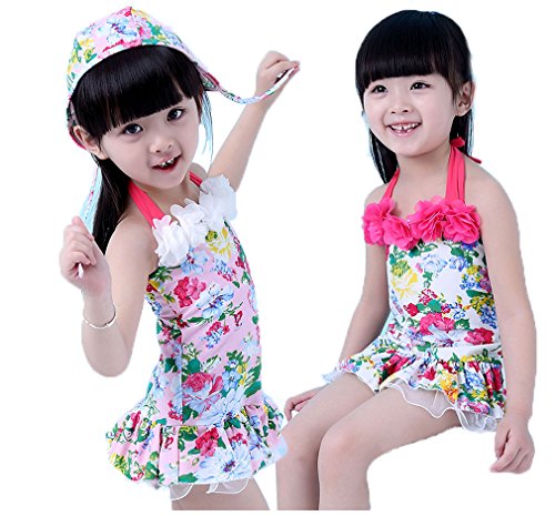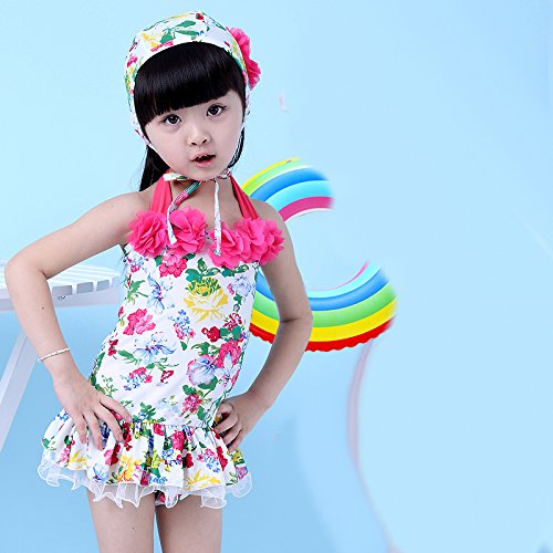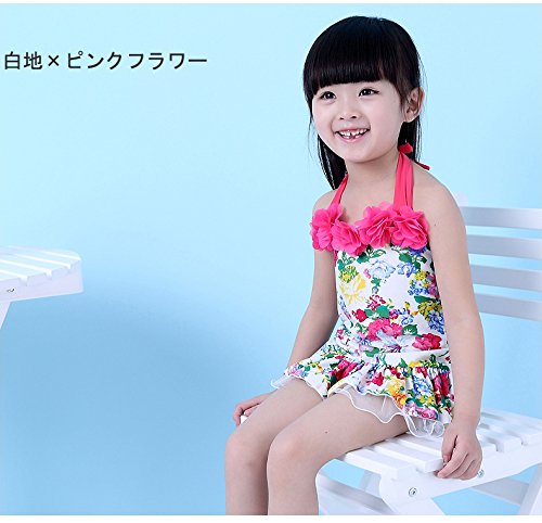 女の子 水着 可愛い 連体 女児 キッズ ベビー 子供服 ミズギ スイミングウェア 花模様 ワンピース水着 キャップ付き (S, 白地×ピンクフラワー)